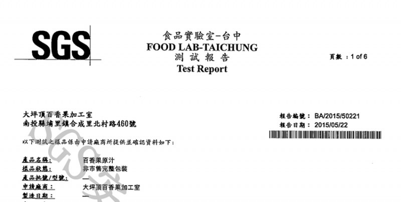 為讓客人安心食用,大坪頂百香果園已通過SGS檢驗認證......